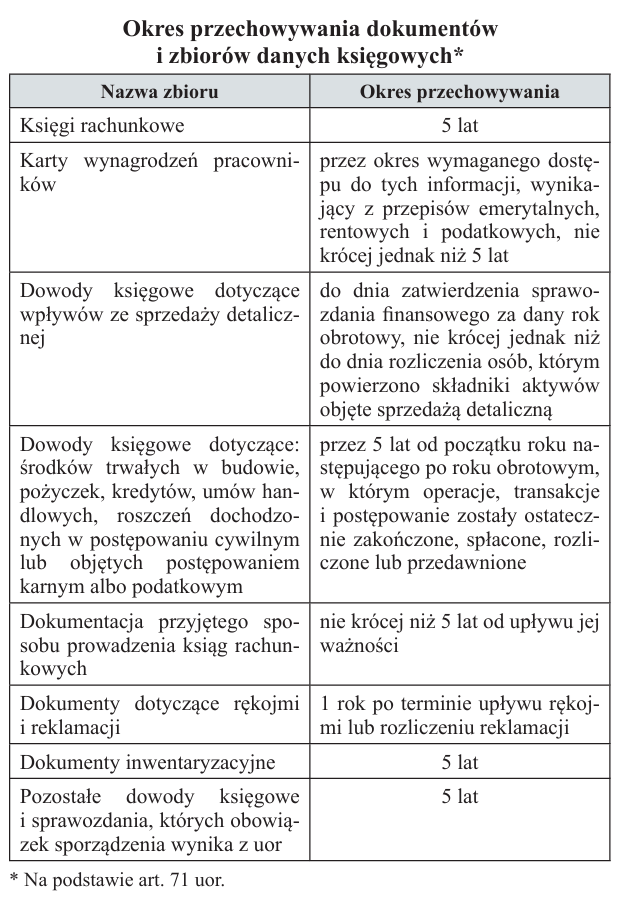 Okres przechowywania oblicza się od początku roku następującego po roku obrotowym, którego dane zbiory dotyczą. Przy jego ustalaniu należy ponadto uwzględniać inne regulacje, a zwłaszcza przepisy Op. Według art. 86 § 1 Op podatnicy obowiązani do prowadzenia ksiąg podatkowych przechowują księgi i związane z nimi dokumenty do czasu upływu okresu przedawnienia zobowiązania podatkowego, chyba że ustawy podatkowe stanowią inaczej. Zgodnie z ogólną zasadą ujętą w art. 70 § 1 Op zobowiązanie podatkowe przedawnia się z upływem 5 lat, licząc od końca roku kalendarzowego, w którym upłynął termin płatności podatku. Ponieważ termin płatności podatku dochodowego za dany rok obrotowy przypada w roku następnym, okres przechowywania dokumentacji dla celów podatkowych jest dłuższy od okresu wymaganego przepisami uor. Warto również pamiętać, że okres przedawnienia może zostać zawieszony lub ulec przerwaniu na skutek wystąpienia okoliczności wymienionych w art. 70 i art. 71 Op[1], co wpływa na wydłużenie terminu przechowywania dokumentacji podatkowej.