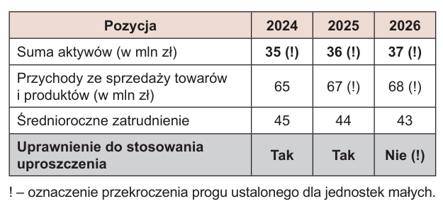 W 2026 r. spółka ponownie przekracza progi ilościowe w dwóch z trzech kryteriów. Przekroczenie kryteriów nastąpiło zatem w dwóch ostatnich latach obrotowych. Wynika z tego, że spółka przestaje być jednostką małą i staje się jednostką średnią już w 2026 r. Jej zasady (polityka) rachunkowości muszą więc ulec rewizji – nie jest uprawniona do stosowania uproszczeń przeznaczonych dla jednostek małych już w sf za 2026 r. Jest zobowiązana do zastosowania kryteriów ujmowania leasingu opisanych w art. 3 ust. 4 i 5 uor.