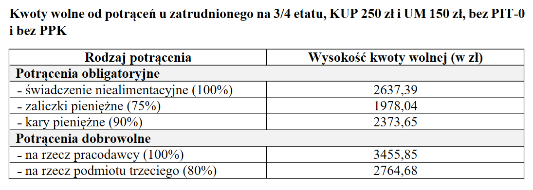 Pracownik jest zatrudniony na 3/4 etatu, korzysta z KUP 250 zł i UM 150 zł oraz nie korzysta z PIT-0 ani z PPK. Sposób obliczania w 2026 r. kwot wolnych od: