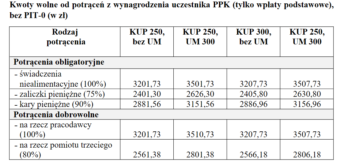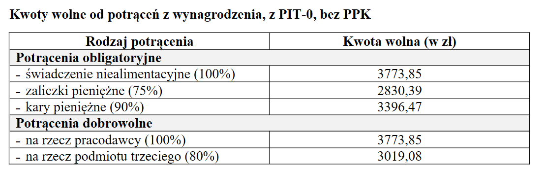 Pracownikowi na pełnym etacie, nieuczestniczącemu w PPK, lecz korzystającemu z PIT-0 (ulgi określone w art. 21 ust. 1 pkt 148 i 152–154 updof: dla młodych, dla rodzin 4+, dla pracującego seniora, na powrót), a więc któremu pracodawca nie potrąca zaliczek na PIT, kwoty wolne od potrąceń ustala się następująco: