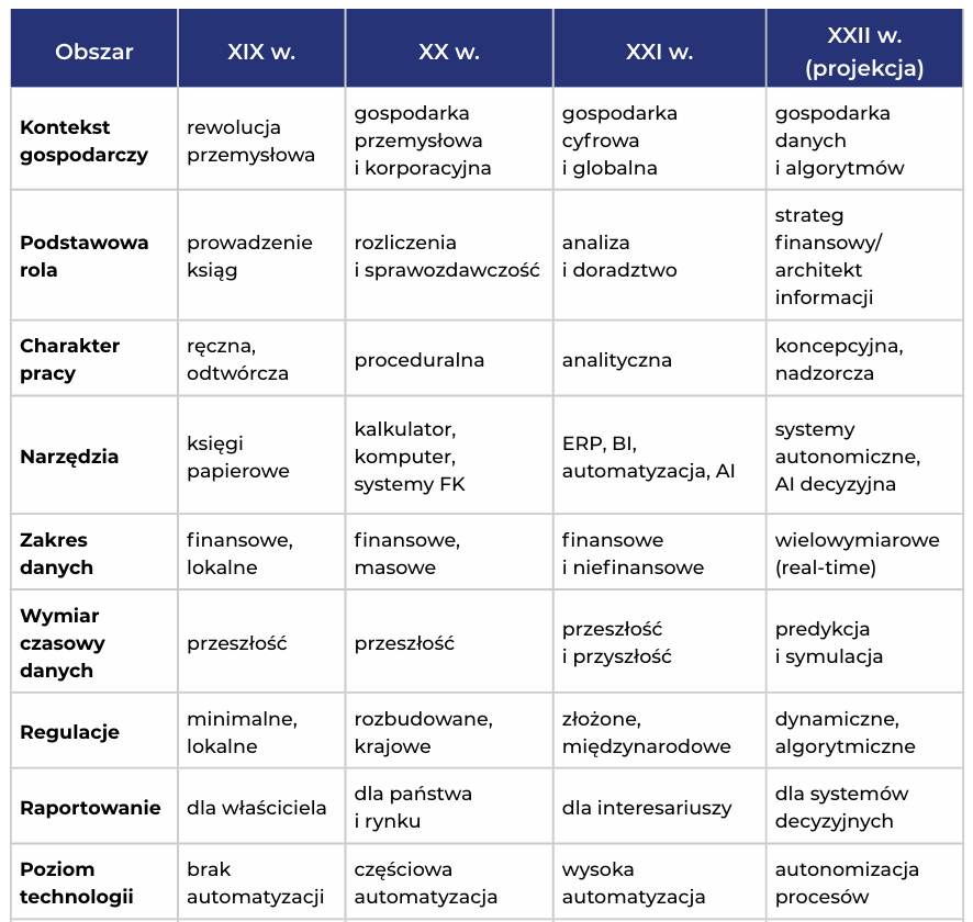 Historia rozwoju zawodu księgowego, ujęta skrótowo w tabeli, pokazuje, że jego istotą nie jest technika ewidencji, lecz odpowiedzialność za jakość i znaczenie informacji ekonomicznej w zmieniającym się świecie.