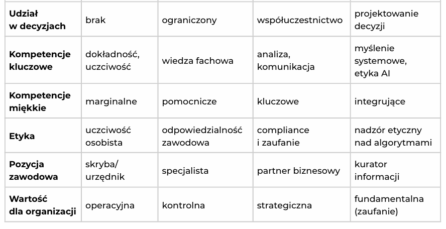 Zmienia się w związku z tym profil kompetencyjny idealnego księgowego.O ile w tradycyjnym modelu dominowały wiedza fachowa, znajomość przepisów prawa, dokładność, to w nowym równie ważne stają się umiejętności analityczne, interpretacji i prognozowania. Księgowy XXI wieku wykorzystuje bowiem dane finansowe, ale też niefinansowe, do wspierania decyzji zarządczych, prognozowania oraz oceny ryzyka. Zmienia się zakres informacji, za które odpowiada: o ile wcześniej dominowało raportowanie finansowe, o tyle obecnie coraz większą rolę odgrywają dane niefinansowe. Dotyczy to w szczególności raportowania ESG i zrównoważonego rozwoju, które staje się istotnym elementem komunikacji z interesariuszami.