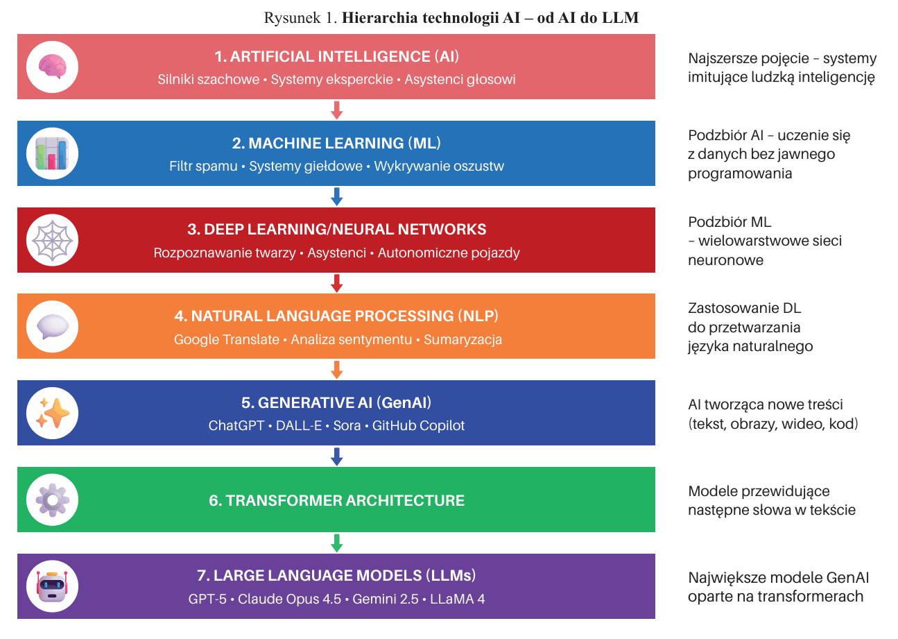 Rysunek 1 porządkuje kluczowe pojęcia w formie schematu hierarchicznego – od najszerszej kategorii sztucznej inteligencji do rozwiązań najbardziej wyspecjalizowanych, skoncentrowanych na pracy z językiem. Taki układ pozwala szybko zorientować się, które pojęcia są „parasolem” obejmującym wiele metod, a które stanowią tylko jeden z wąskich podzbiorów. Z tego powodu interpretacja zaprezentowanych pojęć wymaga przejścia przez kolejne poziomy hierarchii: każdy z nich zawęża zakres, doprecyzowuje mechanizm działania oraz wskazuje typowe zastosowania: