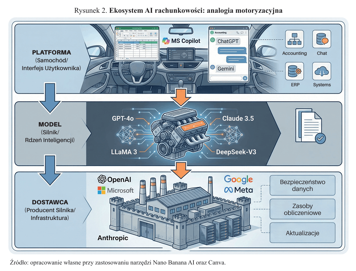Kluczowe znaczenie ma rozróżnienie trzech warstw: dostawcy, modelu i platformy. Taki podział porządkuje rynek, ułatwia ocenę ryzyka i wybór narzędzia „w sam raz” do procesu. Sama nazwa platformy używanej na co dzień nie mówi jeszcze, jaki model faktycznie generuje wynik, jakie są zasady bezpieczeństwa danych, jak działa logowanie aktywności ani czy możliwa jest audytowalność. Dla każdej organizacji decyzja o wykorzystaniu AI powinna być traktowana analogicznie do wyboru systemu informatycznego: zaczyna się od celu i wymagań kontrolnych, a dopiero potem przechodzi do doboru narzędzia, jego konfiguracji i zasad użytkowania. Wdrażanie AI w rachunkowości wymaga zachowania równowagi między korzyściami a ograniczeniami, w tym troski o integralność i poufność danych, możliwość wyjaśnienia wyników oraz zgodność z obowiązującymi regulacjami. Szczególne znaczenie mają kompetencje hybrydowe księgowych, łączące wiedzę finansową z umiejętnością krytycznej pracy z danymi i narzędziami AI, oraz świadome zarządzanie relacją człowiek–AI, oparte na etyce i profesjonalizmie zawodowym.