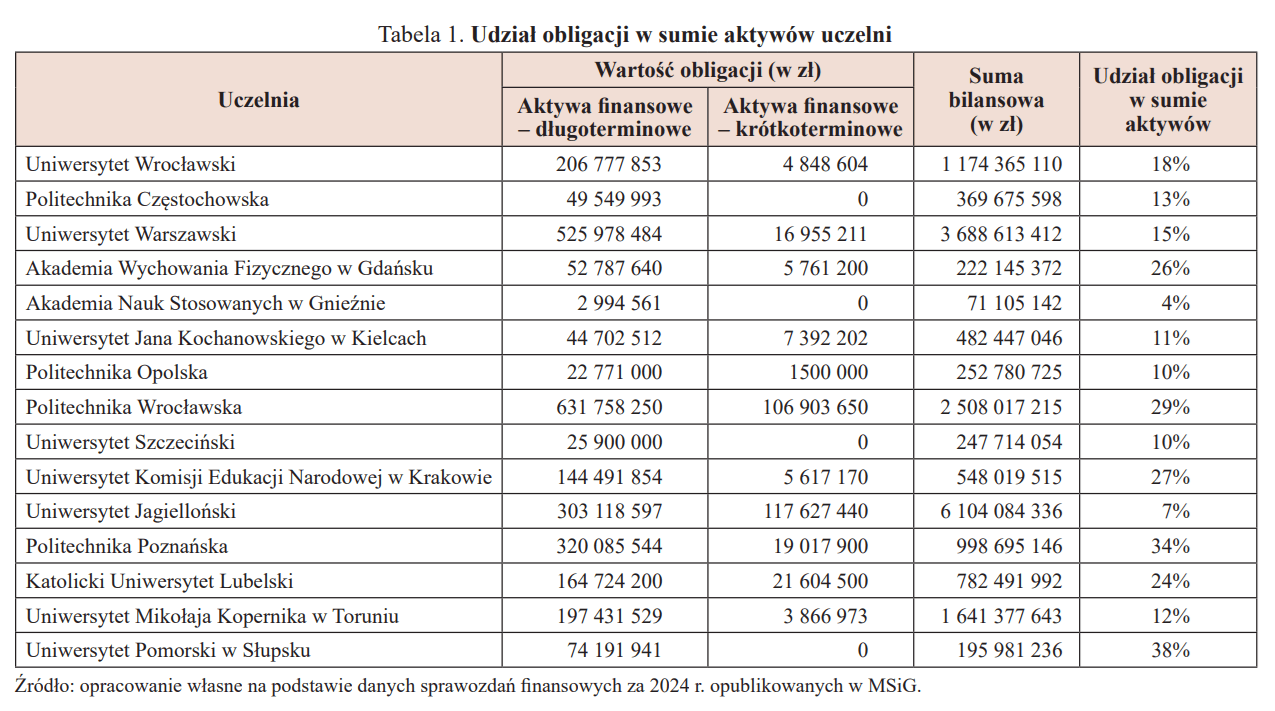 W artykule skupiono się na klasyfikacji i wycenie obligacji Skarbu Państwa otrzymanych nieodpłatnie przez uczelnie publiczne. Zagadnienie to jest istotne, gdyż w latach 2019–2025 uczelnie otrzymały obligacje o wartości ponad 9 mld zł. W przypadku niektórych uczelni udział obligacji w sumie aktywów jest bardzo duży, co ilustruje tabela 1. Uczelnie publiczne należą do jednostek sektora finansów publicznych, więc każdy obywatel naszego kraju ma prawo do rzetelnej i precyzyjnej informacji w tym zakresie.