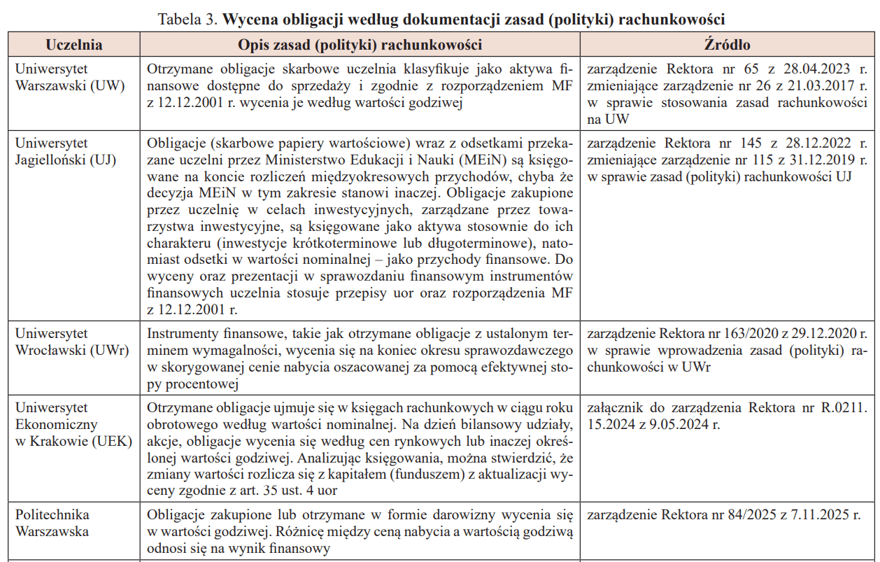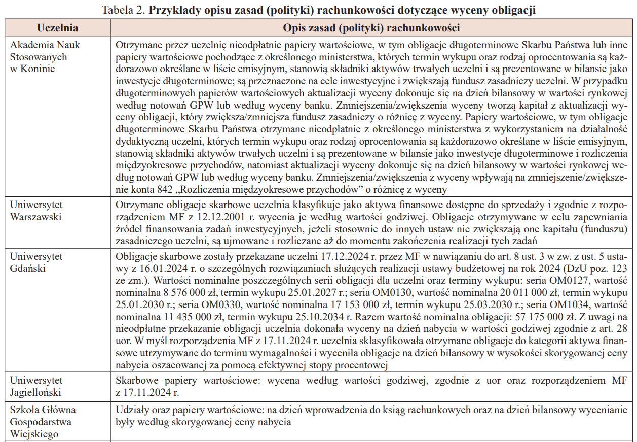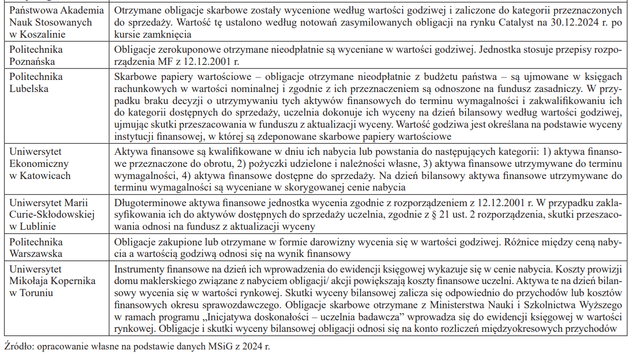 2. Uczelnie, które informują o wycenie obligacji, często używają bardzo ogólnych sformułowań, wspólnych dla wyceny innych inwestycji finansowych, np. udziałów (akcji), nie zawsze zgodnych z regulacjami prawnymi.
